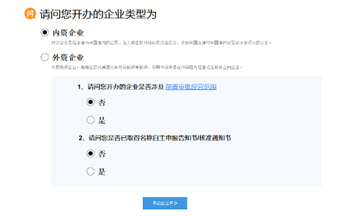 2、選擇內資還是外資。公司經營范圍要如實勾選是否涉及前置審批經營范圍(普通行業的公司無需勾選),如何是特殊行業,需要先經過審批才能申請執照。